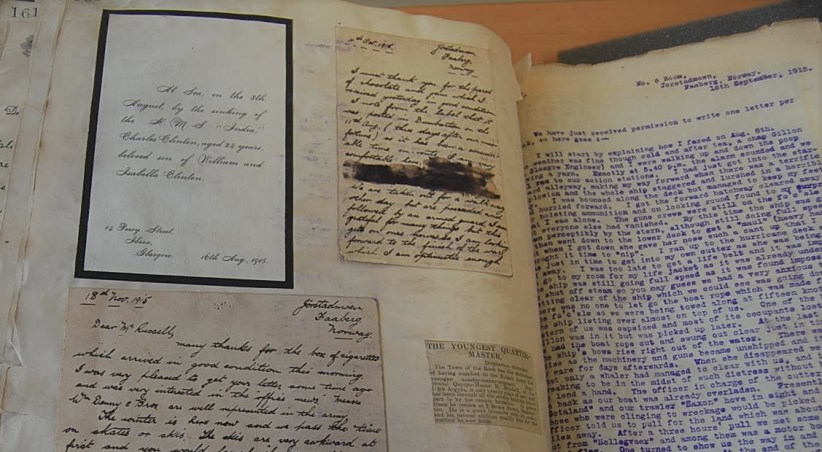 One of the most interesting wartime stories concerns Charles Clinton, aged 24. The scrapbook has a black-edged death announcement from his parents dated 16th August 1915, detailing his death at sea during the sinking of the HMS India. On the following page however is a typed letter from the supposedly deceased Charles, dated the following September and sent from Norway. In this he explains how he survived the attack that sank his ship and caused his misreported death. Further correspondence details his slow progress back from Norway to Scotland. Four months later a postcard from Jorstadmoen, Norway, dated January 1916 gives thanks for “the box of cigarettes ... news of a big fire in Bergen. The Post Office has been destroyed and I’m afraid our mails also.”- perhaps this why there is such a long gap between correspondence.
